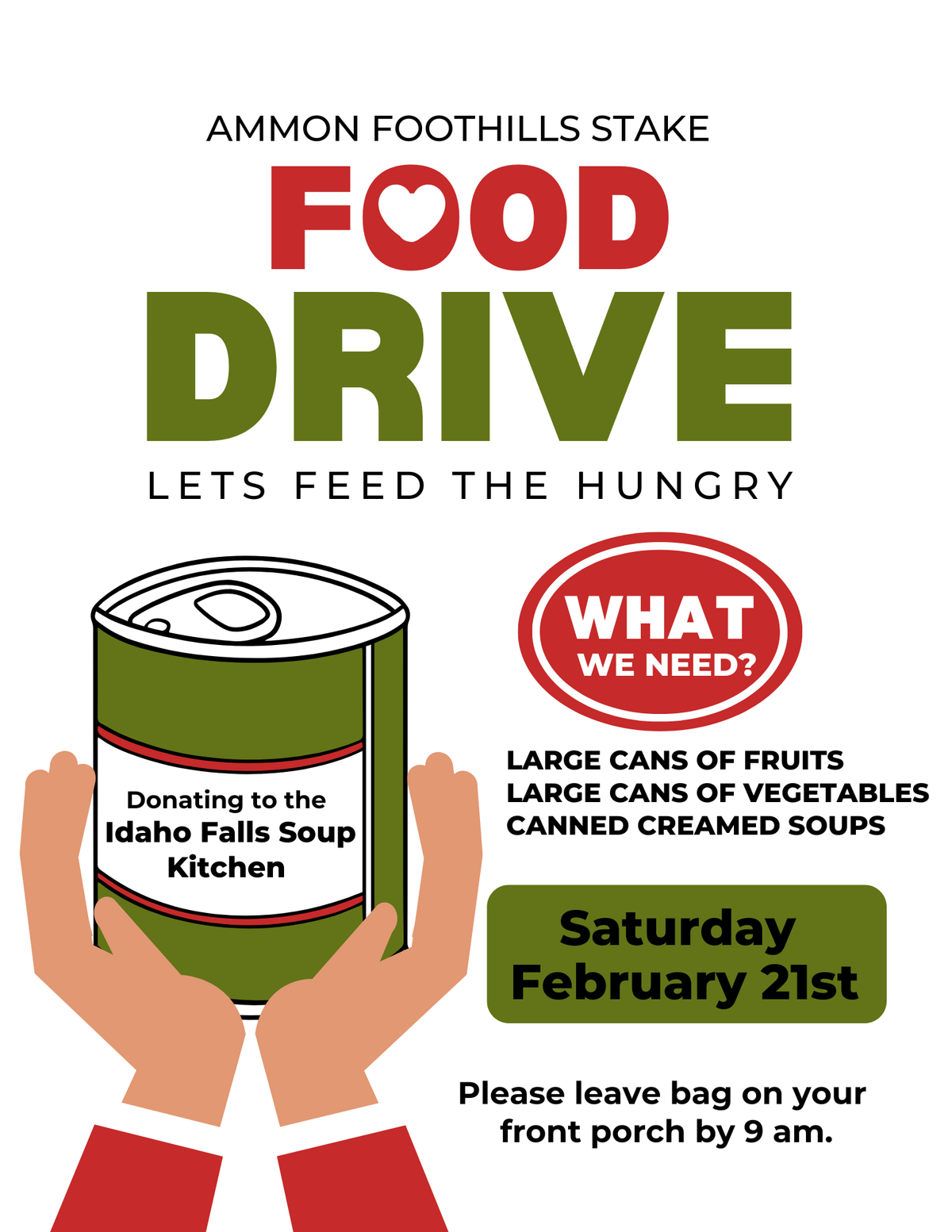 Ammon Foothills Stake Food Drive 9:00 am February 21, 2026 All donations will be delivered to the Soup Kitchen at 301 S. Boulevard between 10:00 am-11:30 am at the back door of the building. The Soup Kichen prefers #303 size cans of Fruits, Vegatables and Creamed Soups