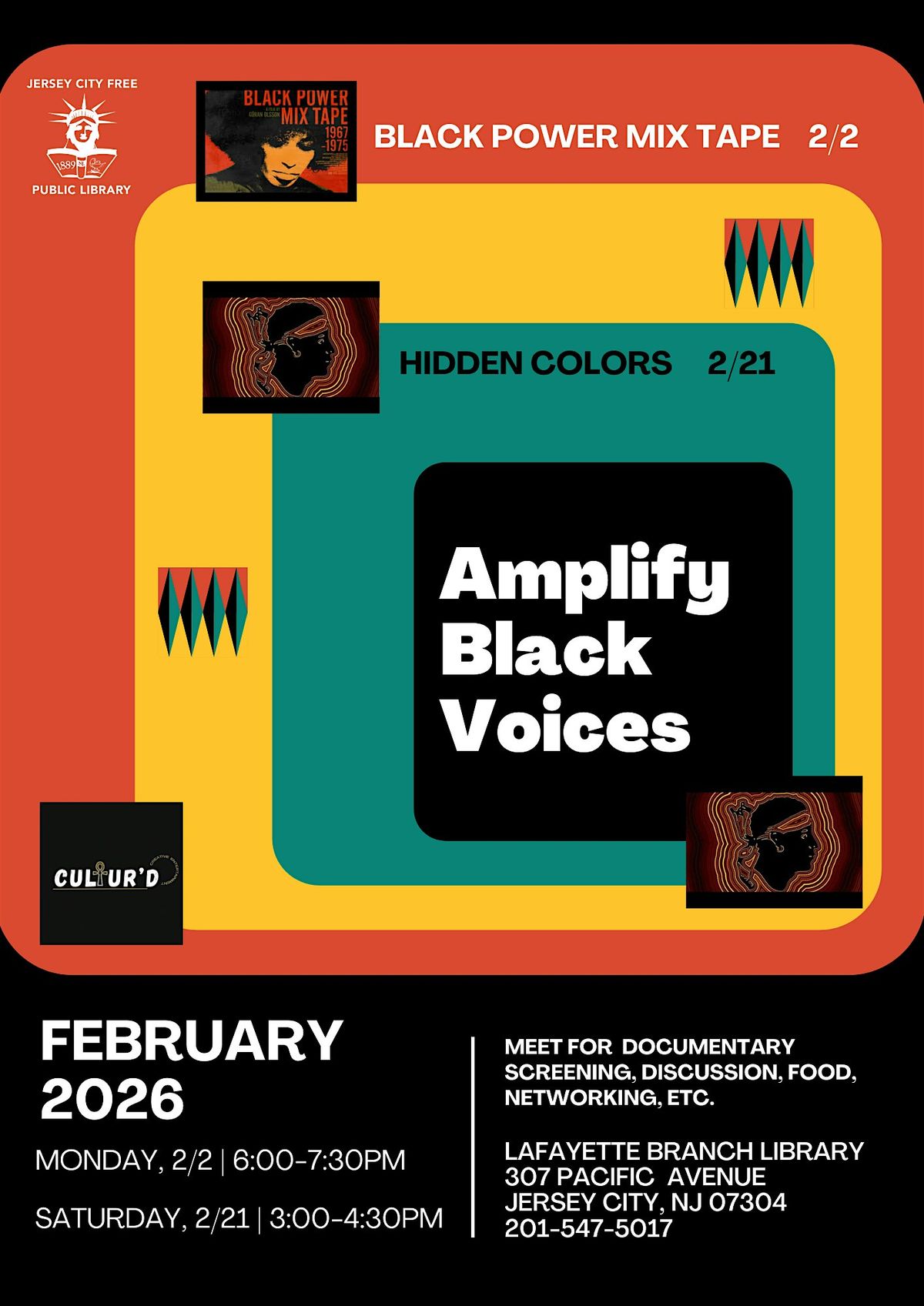 Come join us at Jersey City Free Public Library: Lafayette Branch on February 2 & 21 2026 for a day of celebrating and honoring Black voices.