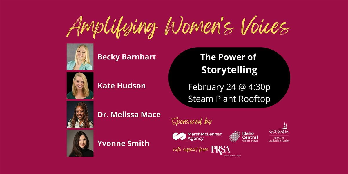 Amplifying Women's Voices is generously supported by ICCU and Marsh McLennan Agency, as well as Gonzaga University's School of Leadership Studies. The Power of Storytelling event is supported by The Public Relations Society of America (PRSA) Greater Spokane Chapter, a professional organization dedicated to supporting and connecting PR and communications professionals in the Inland Northwest. Members gain access to local networking events and professional development resources that improve their skills, no matter their experience level.