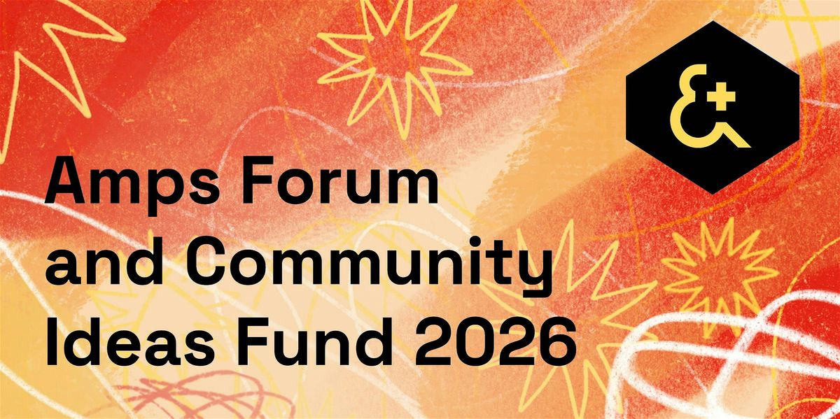 Image description: A colourful abstract background with brushstrokes in red, orange and yellow tones. Overlaid is text that reads 'Amps Forum and Community Ideas Fund 2026'. In the top right hand corner is the Amps logo; the ampersand and plus symbols in a hexagon.