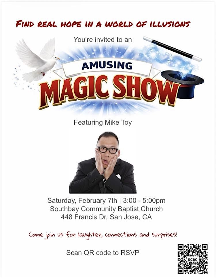 Join us in person for an afternoon of laughter, connections, and cool surprises. Magician Mike Toy has received rave reviews from some of the largest corporations in the world. "Receiving a magic kit at 8 years old, he quickly learned every trick and began performing magic shows. Now he provides high-quality, interactive magic shows to exclusive corporate events and posh private parties throughout the San Francisco Bay Area. Mike has amazed San Francisco 49ers’ legends Jerry Rice, Joe Montana, and Vernon Davis...!" Don't miss out on this unique experience that leave you not only amazed and smiling BUT leave with a message of real hope and peace that we all desperately need in today's world because there is a void that is missing in our hearts that we are all searching for. Bring your friends and an open mind to watch and listen! Raffles and snacks following! FREE Childcare for ages 10 and under. RSVP by Scanning QR Code below!
