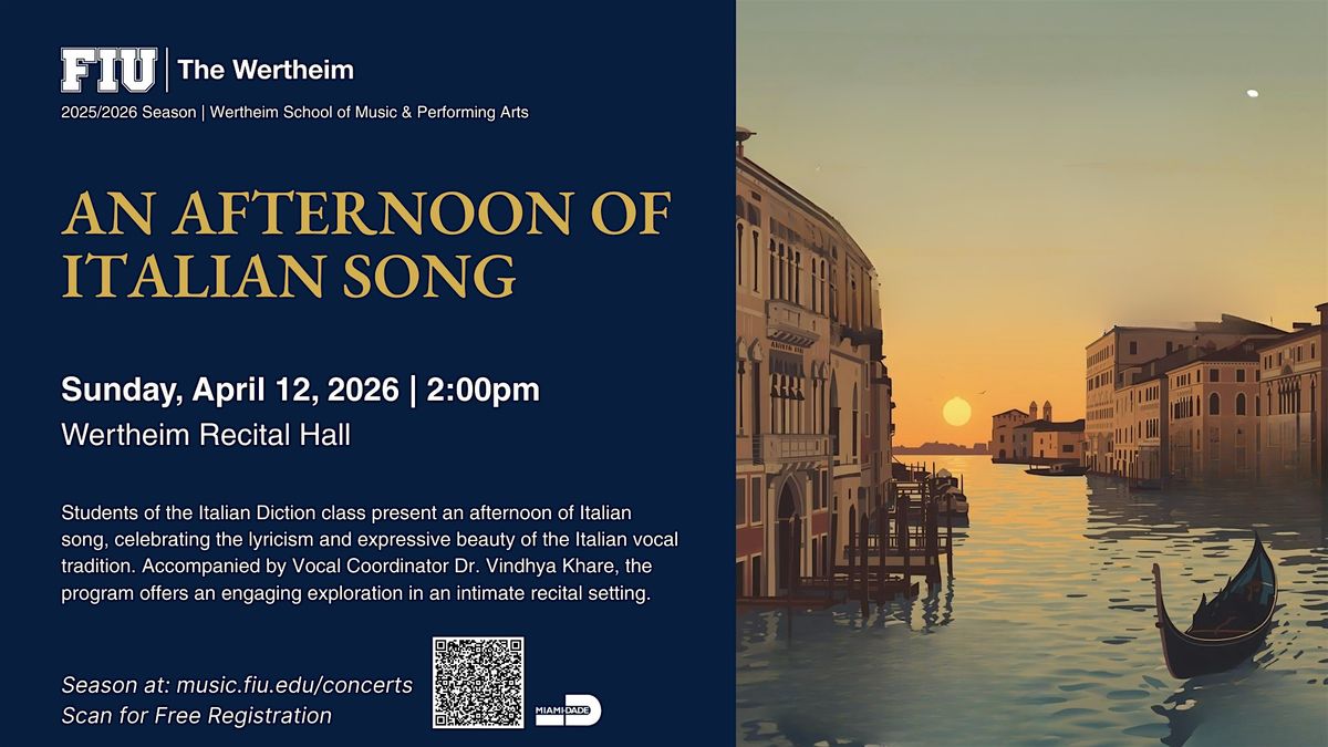 The students of the Italian Diction class present An Afternoon of Italian Song, a program celebrating the beauty and expressive depth of Italian vocal repertoire. Featuring works that highlight the lyricism, clarity, and dramatic nuance of the Italian language, this performance showcases the artistry and growth of FIU’s vocal students.