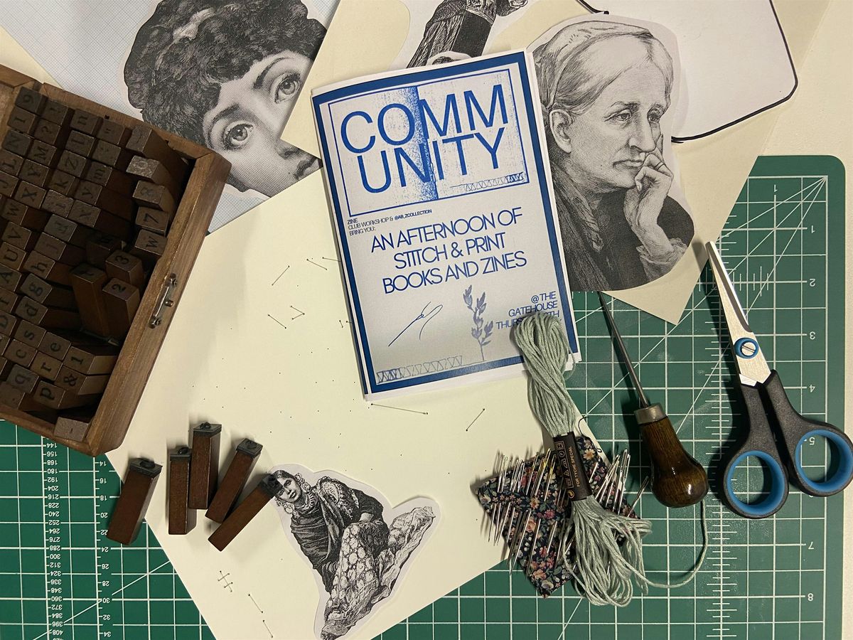 An afternoon led by book artist and zine collection holder Jen Ouson, built around community. Share a creative space and enjoy the act of making alongside relaxed conversation as we use card and collage, with simple print and stitched elements, to create a small series of loose pages that will be bound into an artist’s book.