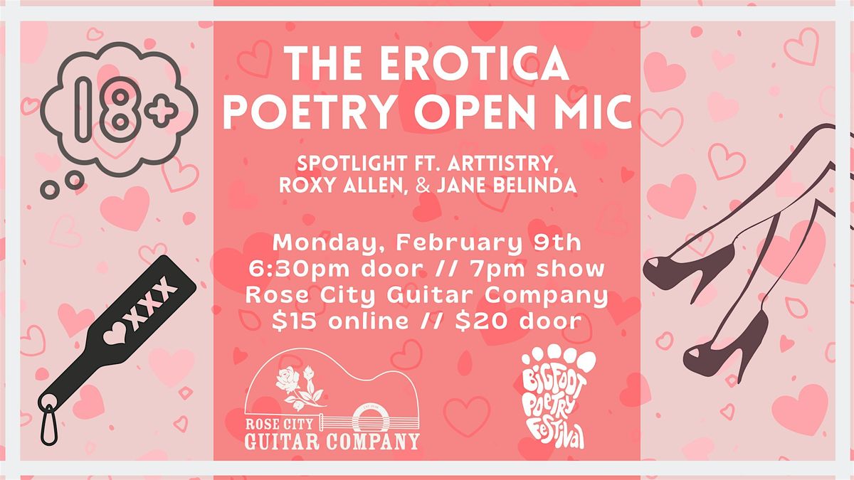 Come out for a night of kinky metaphors, smutty limericks, sensual odes, & more! Spotlight readers Arttistry, Roxy Allen, & Jane Belinda!About this Event