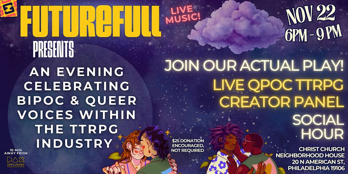 Queer and BIPOC creatives face unique challenges across the entire axis of creation in the TTRPG community. We at Futurefull are beyond excited to be throwing an event the weekend of PAX Unplugged celebrating the joy diversity brings to the tabletop, and uplifting the true value queer and BIPOC creatives and artists bring to our community.