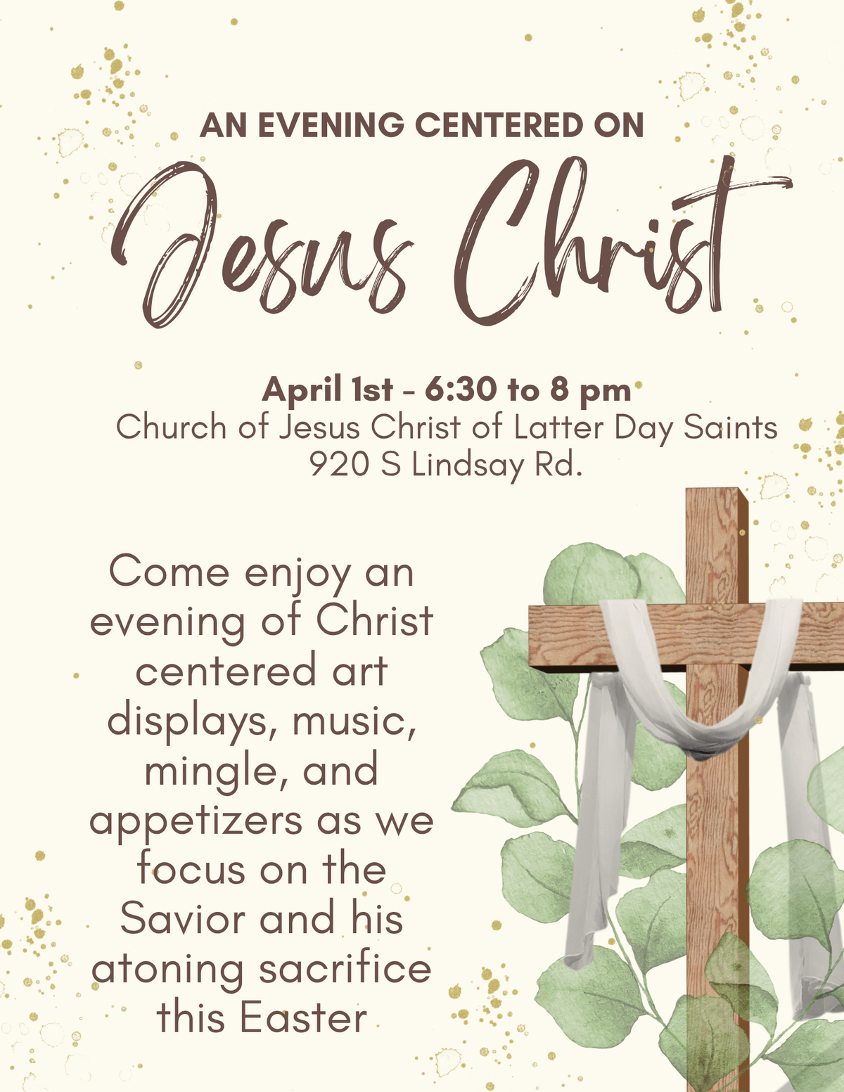 Come enjoy an evening of Christ-centered art displays music. Mingle and enjoy some appetizers as we focus on the Savior and His atoning sacrifice this Easter. Everyone is Welcome.