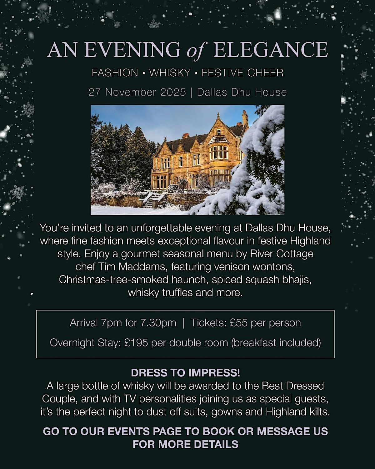 This year we are delighted to host the event at the prestigious Dallas Dhu House in Forres, surrounded by its beautiful house and grounds.