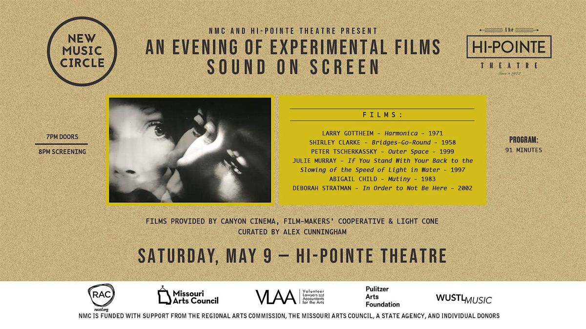 New Music Circle presents an evening of experimental films at the Hi-Pointe Theatre. This selection of films focuses on varied approaches to experimental sound in avant garde film, highlighting techniques ranging from ingenious uses of diegetic audio, experimental music (both soundtrack and live performance), and heavily manipulated found-sound materials.