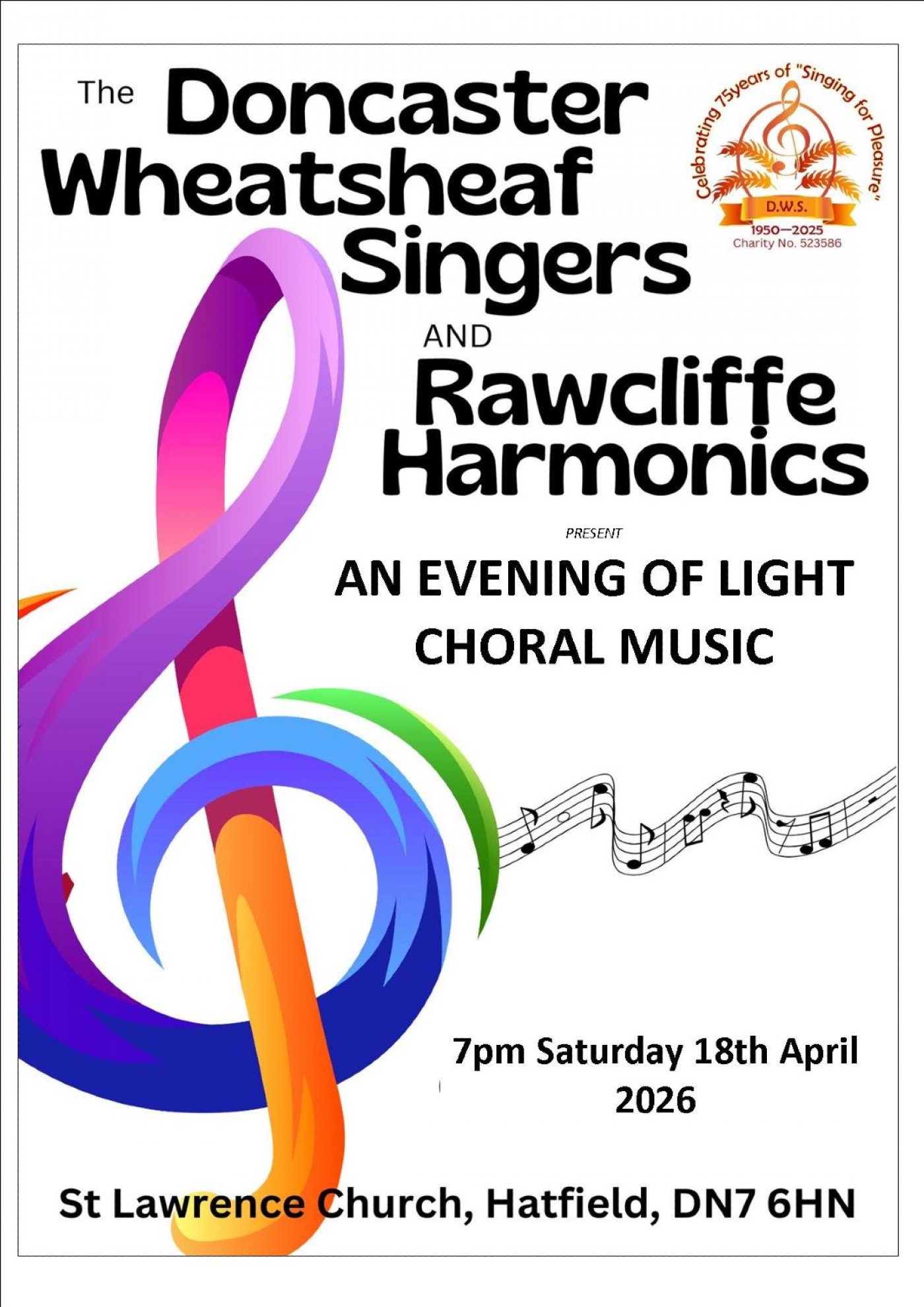 A choral concert featuring The Doncaster Wheatsheaf Singers & Rawcliffe Harmonics, Tickets £8 each - available from the Church or choir members or PAY ON THE DOOR