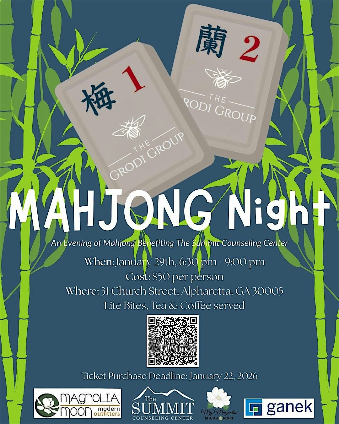 Join us for a fun evening of Mahjong benefitting The Summit Counseling Center. Beginners and experienced players welcomed.