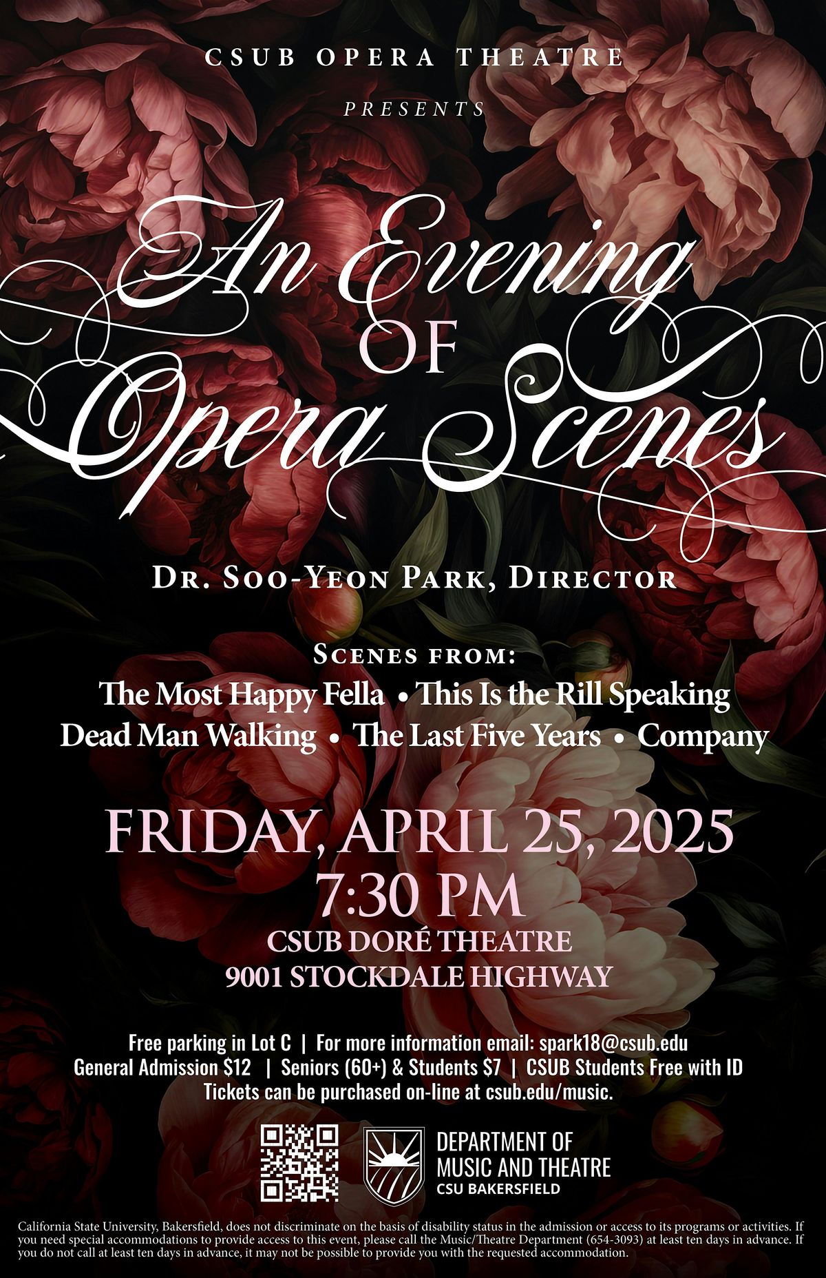 CSUB Opera Theatre presents a fully staged and costumed scenes program, featuring an exciting and wide-ranging selection of excerpts from grand opera to musical theatre such as The Magic Flute, Songs for a New World, Carmen, and Oklahoma!
