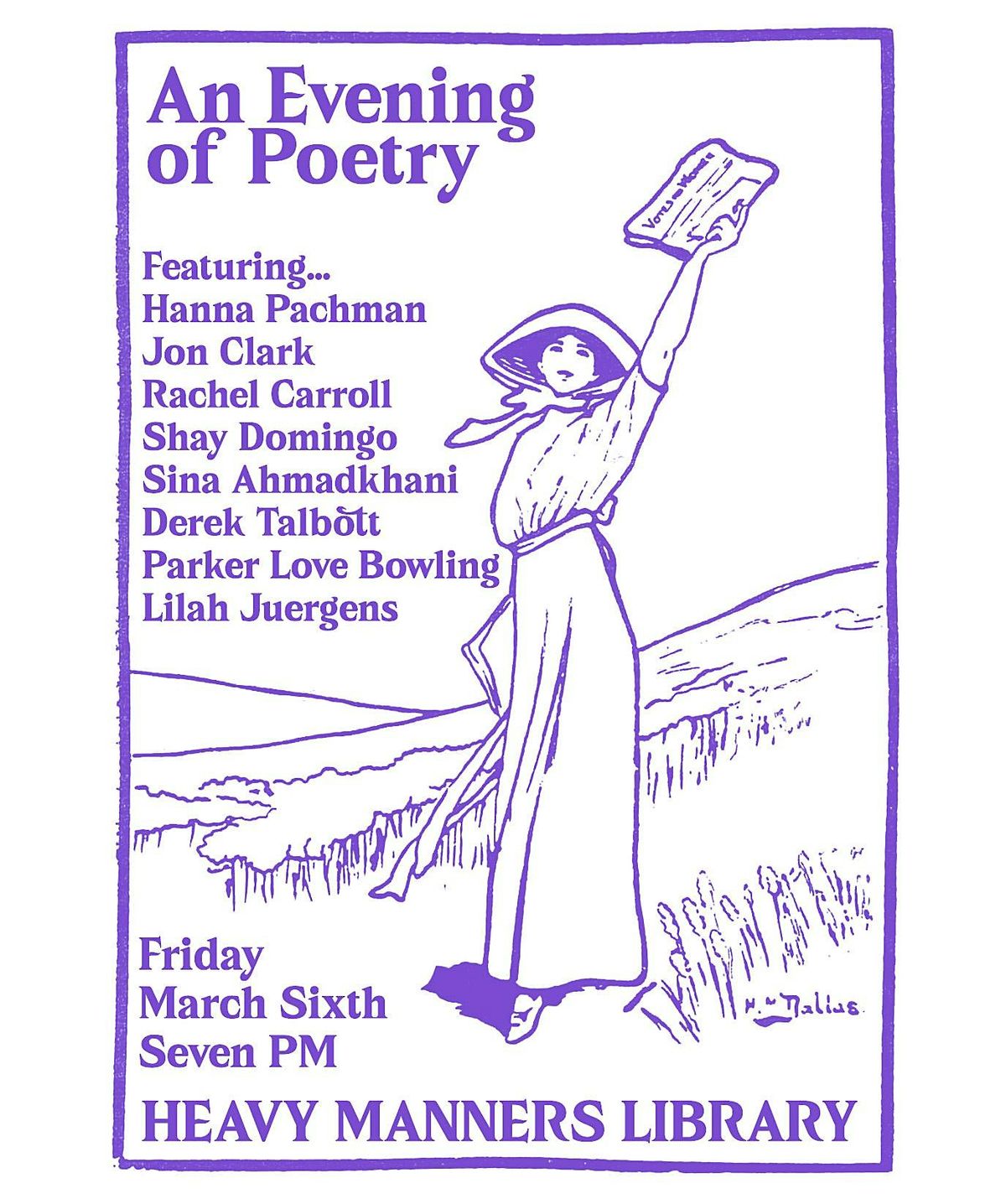 Join us for an evening of poetry featuring Hanna Pachman, Jon Clark, Rachel Carroll, Shay Domingo, Sina Ahmadkhani, Derek Talbott, Parker Love Bowling, and Lilah Juergens.