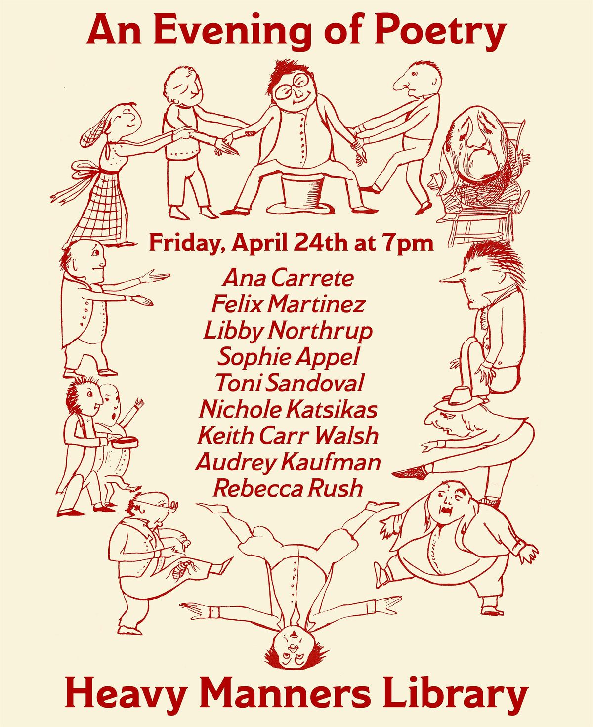 Join us for an evening of poetry featuring Ana Carrete, Felix Martinez, Libby Northrup, Sophie Appel, Toni Sandoval, Nichole Katsikas, Keith Carr Walsh, Audrey Kaufman, and Rebecca Rush.