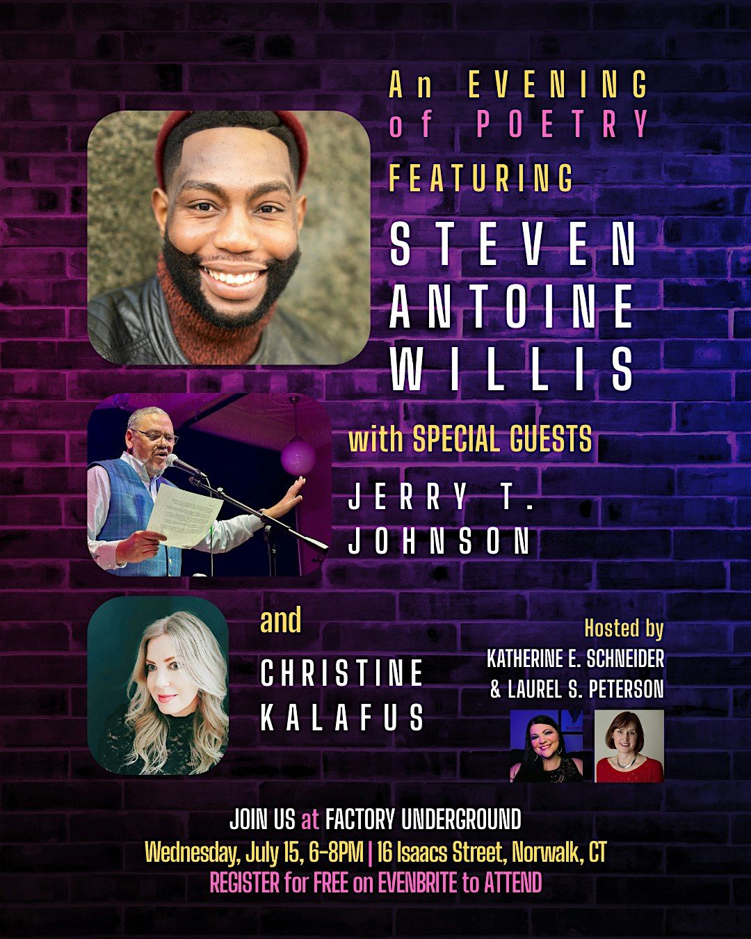 Hosted by Norwalk Poet Laureate Katherine E. Schneider and Norwalk Poet Laureate Emerita Laurel S. Peterson, and set against the vibrant, artistic backdrop of Factory Underground, this lively evening will bring together powerful poetic voices and captivating performances that will move, inspire, and spark conversation.