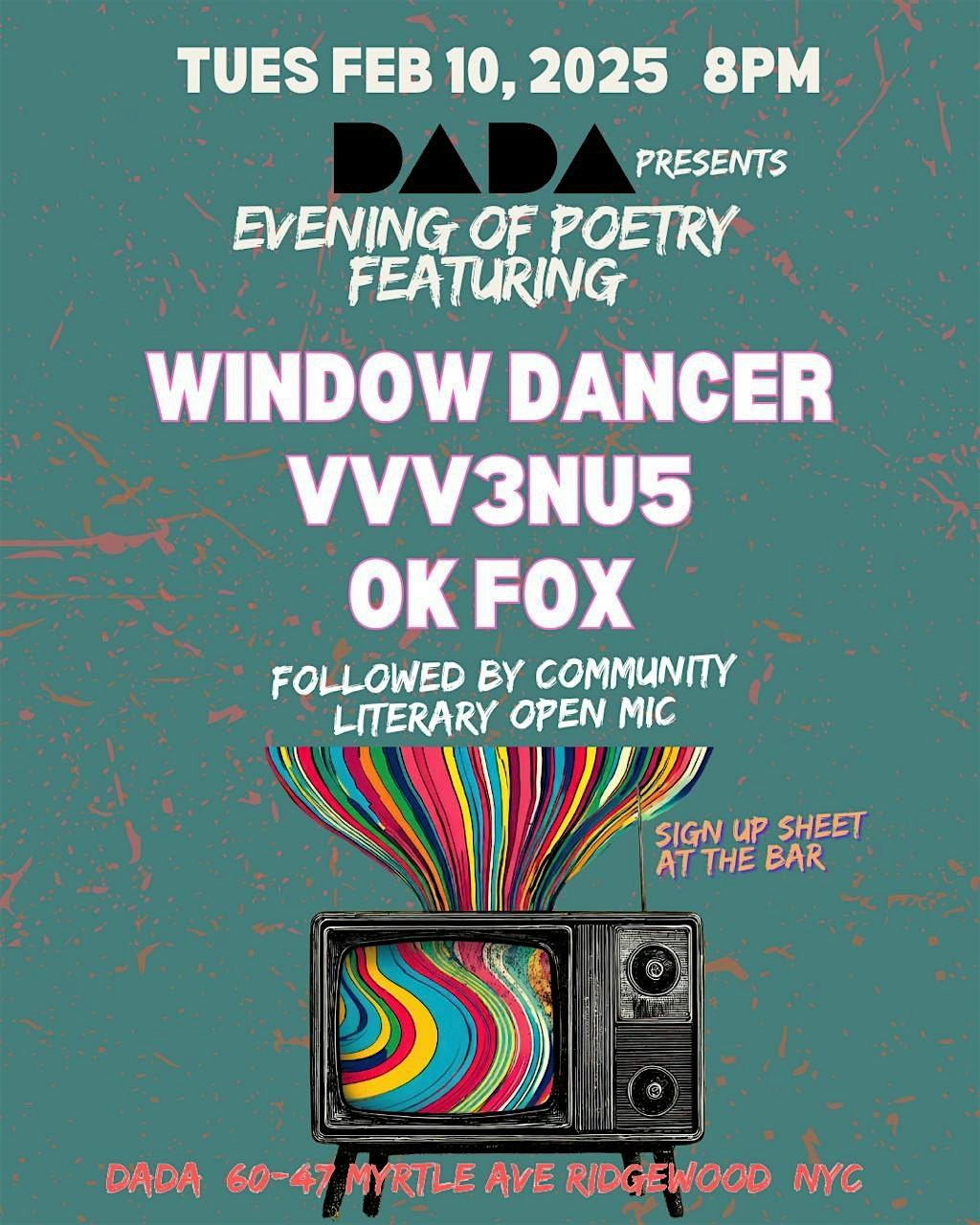 An Evening of Poetry with Window Dancer, VVV3NU5, and OK FOX followed by a literary open mic!