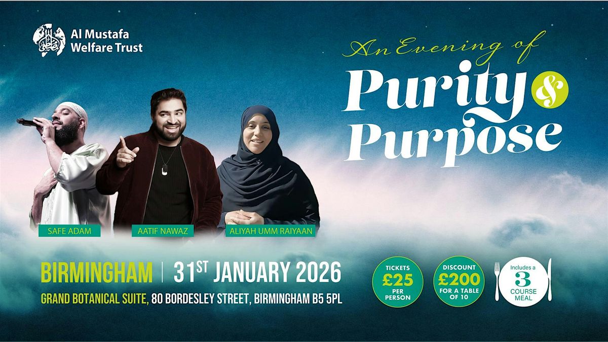 Join us for An Evening of Purity & Purpose — a spiritually enriching and heart-warming gathering featuring renowned performers Safe Adam, Aatif Nawaz, and Khalila Lister.