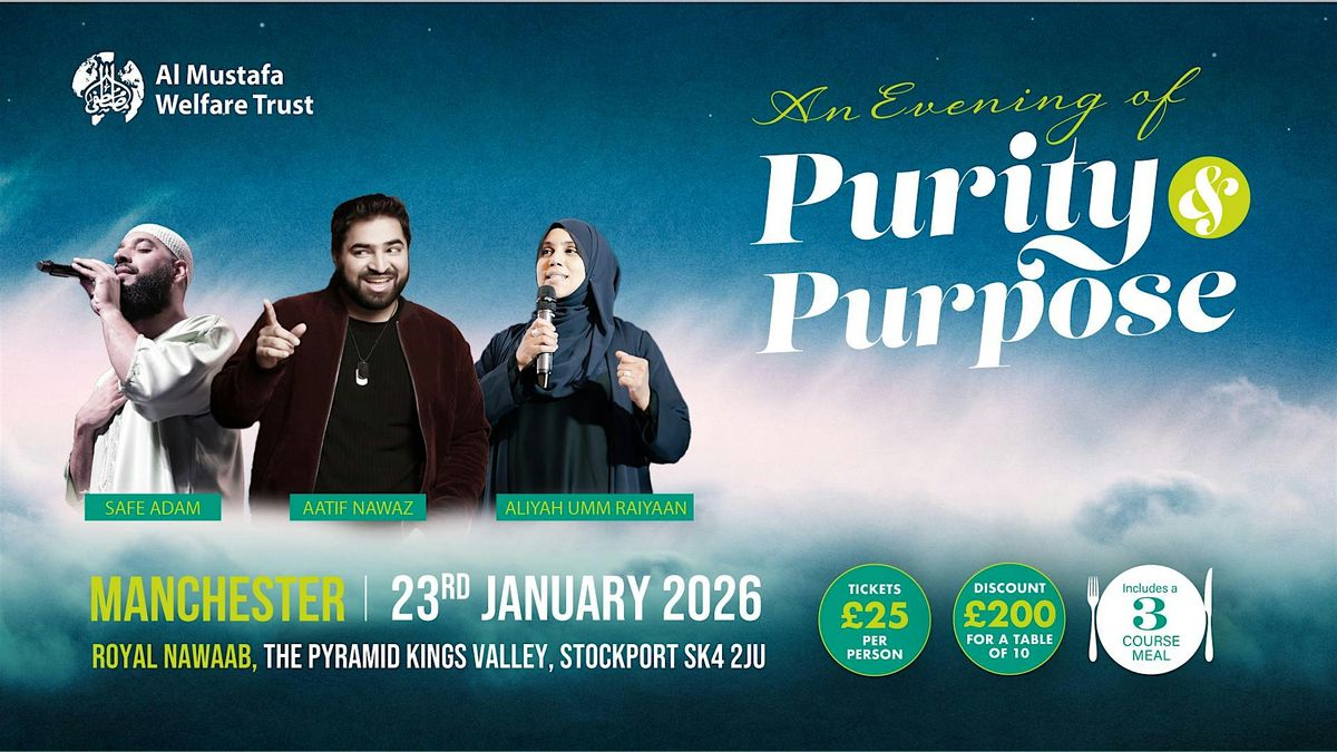 Join us for An Evening of Purity & Purpose — a spiritually enriching and heart-warming gathering featuring renowned performers Safe Adam, Aatif Nawaz, and Aliyah Umm Raiyaan.