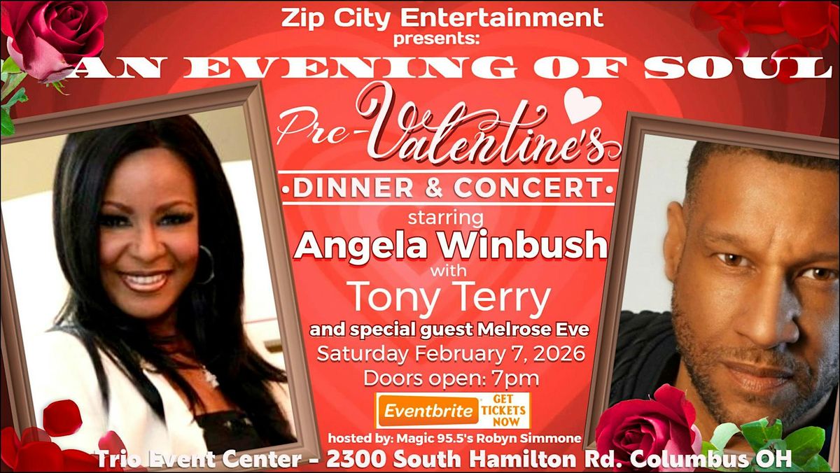 Ready for a grown and sexy night out? Join us in person for the "Evening Of Soul Pre-Valentine's Dinner & Concert". It’s the perfect vibe to celebrate your love with an intimate setting, some great soul food, soulful sounds by the legendary ANGELA WINBUSH and the smooth vocals of TONY TERRY along with a guest performance by new-comer MELROSE EVE. Dress up, bring your favorite person, and let's make it the perfect "Date Night"