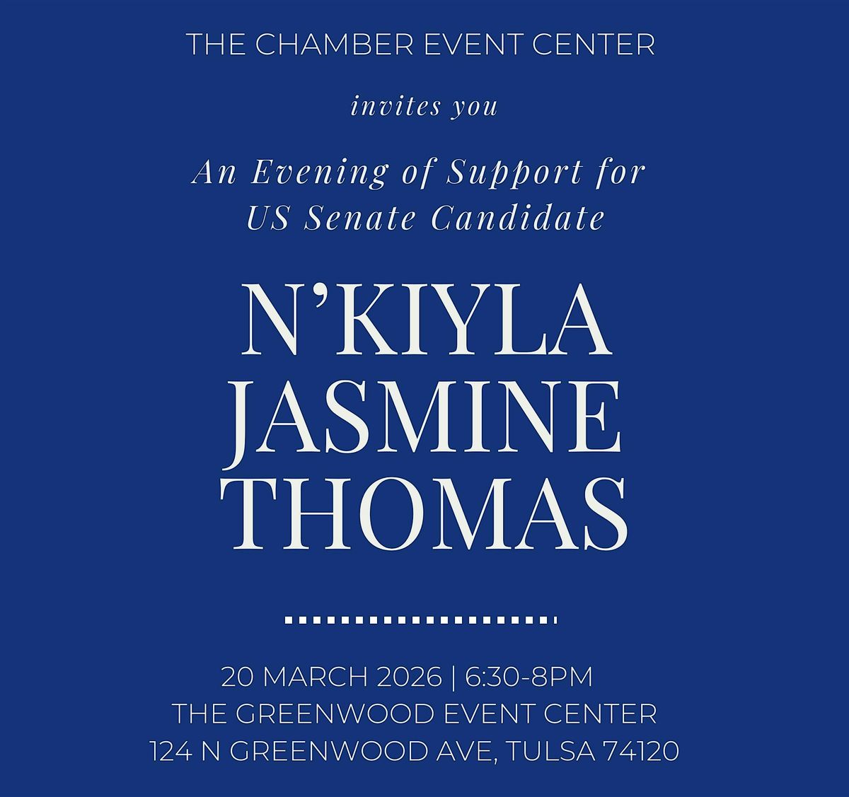 Get ready for a fun, inspiring night as we rally behind US Senate Candidate N’kiyla “Jasmine” Thomas. This is your chance to connect in person,give donations or buy merchandise to show some love, and hear firsthand about Jasmine’s vision for the future. Whether you're a long-time supporter or just curious, everyone’s welcome. Let’s make it an evening to remember!