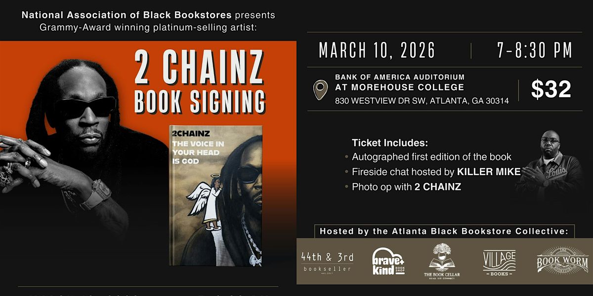 The National Association of Black Bookstores (NAB²), in partnership with the Atlanta Black Bookstore Collective, presents an exclusive evening with 2 Chainz in conversation with Killer Mike. This intimate conversation will explore creativity, faith, growth, and the power of owning your voice, moderated by Killer Mike.