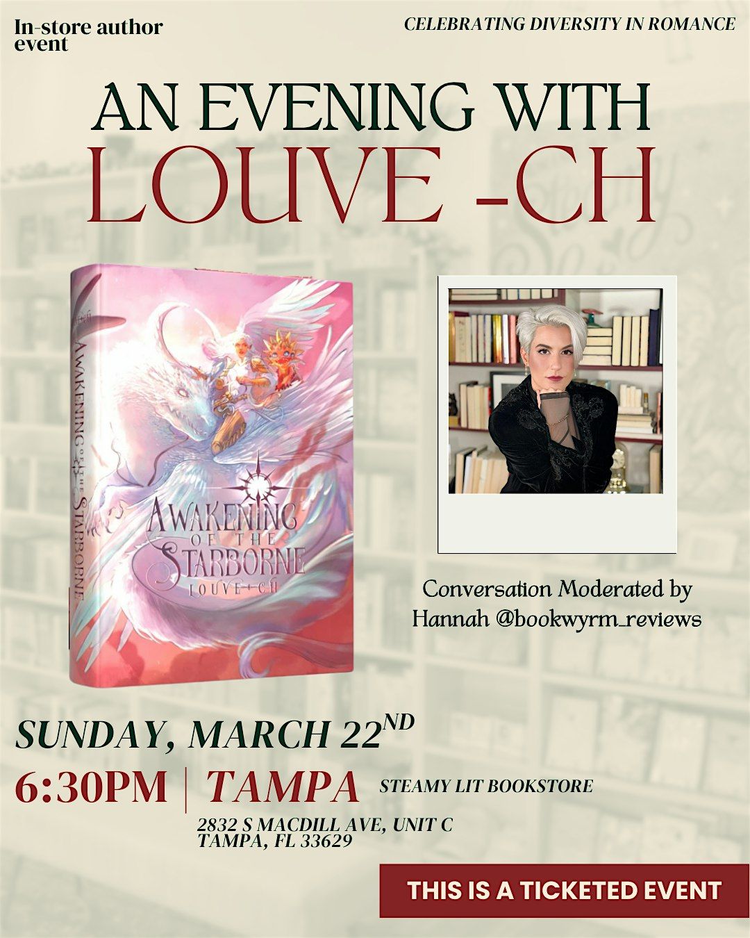 Join us at Steamy Lit Bookstore—Tampa for an enchanting evening with author Louve-Ch, author of Awakening of the Starbourne on Sunday, March 22, from 6:30 PM - 8:00 PM.