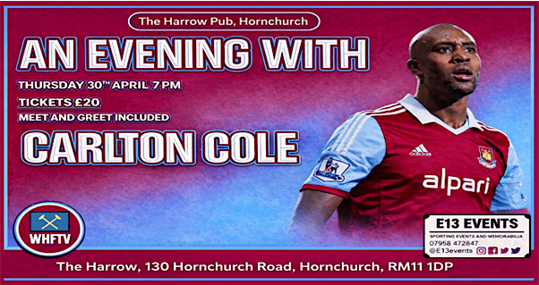 Join us for an unforgettable evening with Carlton, where he'll share stories from his time at West ham including scoring in the 2012 Playoff final win at wembley, the great escape season, plus loads more .......