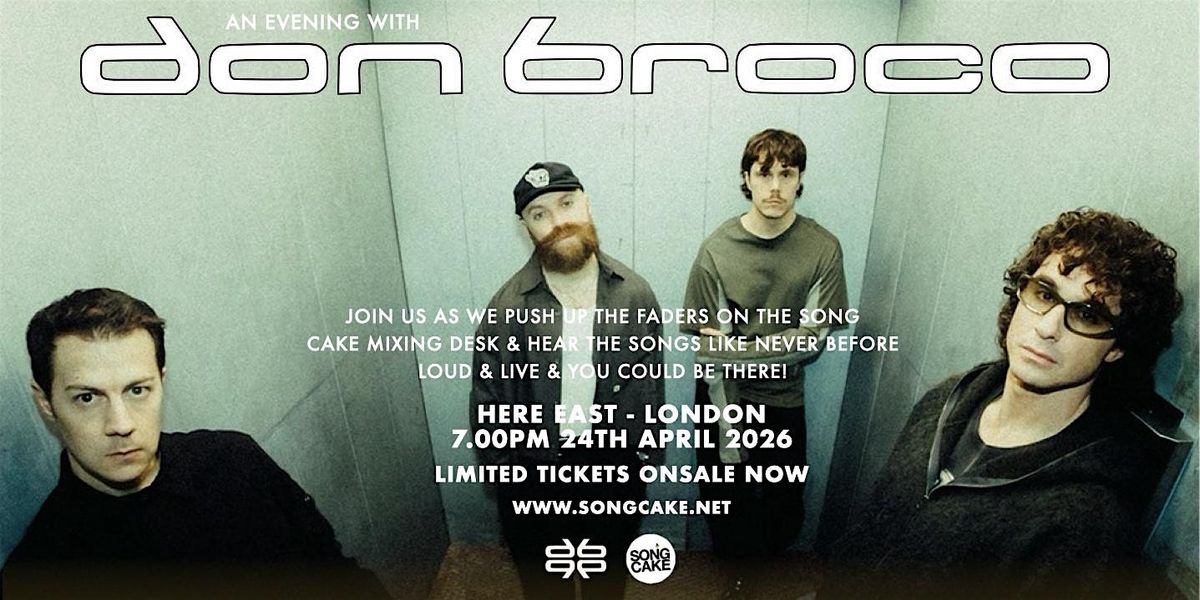Don't miss out on this once in a lifetime opportunity to get up close and personal with DON BROCO ! ONLY 200 lucky fans will be a part of Song Cake history as we record a live 90 minute TV special at our huge East London studio. The band are thrilled to push up the faders on the Song Cake mixing desk & deep dive into some of their favourite tracks. We'll hear isolated drums, guitars, vocals, strings, keys, bass etc all for the first time. Loud, raw and intimate ! There's also time for a coffee chat & fan Q&A. This is TV history in a huge tv studio, live & you could be part of the show!.. Tickets are VERY limited so grab yours now !