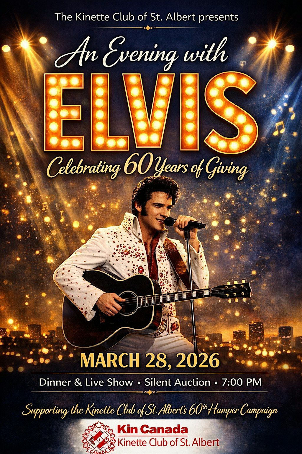 An Evening with Elvis: Celebrating 60 Years of Giving is a special fundraising event taking place on March 28, 2026, in support of the Kinette Club of St. Albert’s 60th Christmas Hamper Campaign.