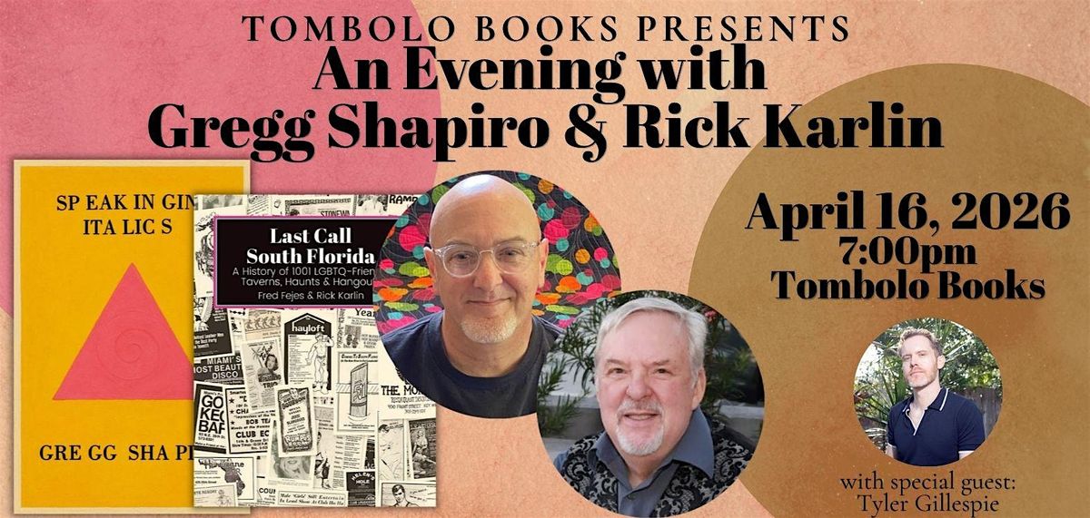 Tombolo Books welcomes authors Gregg Shapiro and Rick Karlin to the bookstore for a celebration of their books: Speaking in Italics and Last Call South Florida! Shapiro and Karlin will be joined by local author Tyler Gillespie!