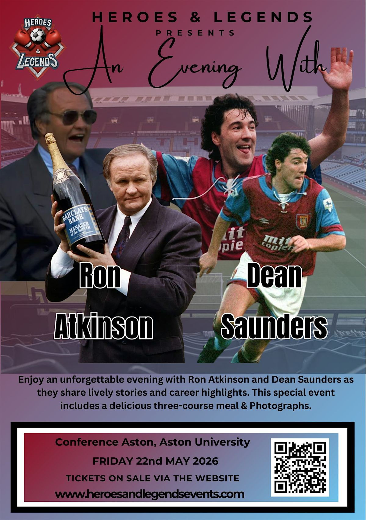 Join football legends Ron Atkinson and Dean Saunders for a night of laughter, stories, and behind-the-scenes tales from their iconic careers. Hosted by Paul Anthony, this special evening includes a three-course meal and plenty of football banter – a must for any fan!