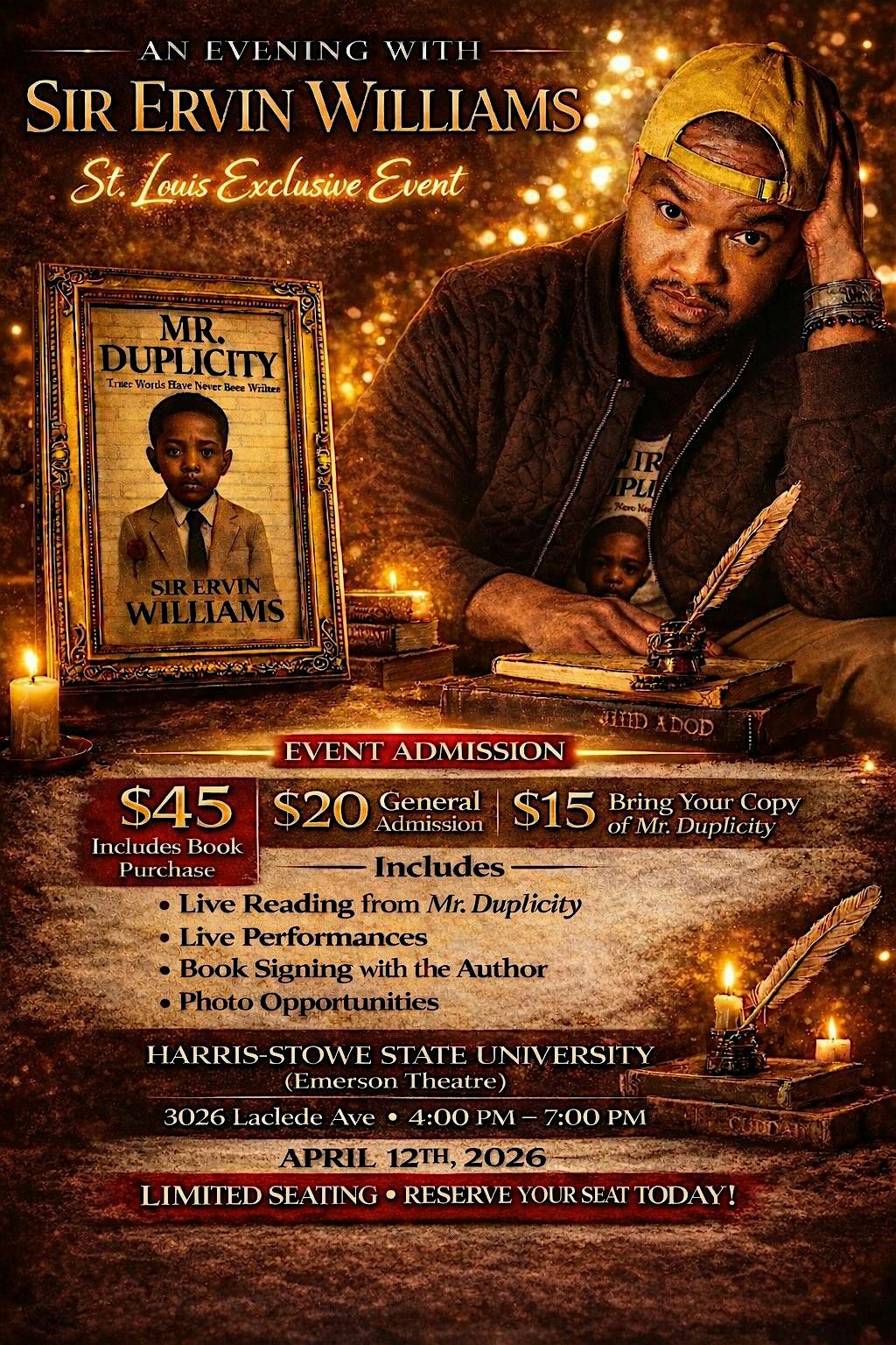 Join us for a live reading and book signing of Mr. Dup at Harris-Stowe State University! Dive into the world of Sir Ervin Williams and enjoy an unforgettable evening filled with great stories and good vibes.
