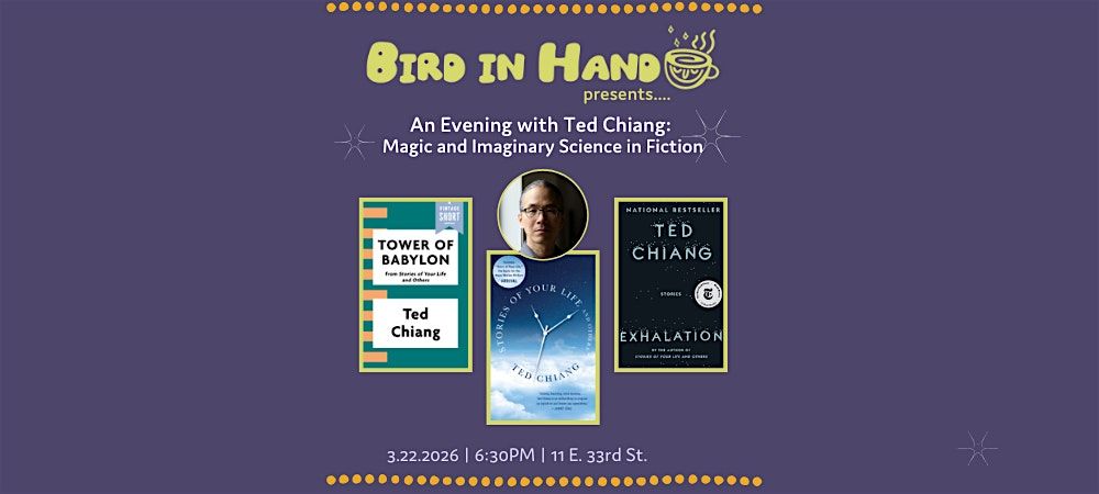 Ted Chiang, author of Exhalation and Stories of Your Life and Others, and author of the novella that inspired "Arrival," joins us for a special event at Bird in Hand! He'll offer a talk entitled "Magic and Imaginary Science in Fiction"-- two themes that underlie and animate his work.