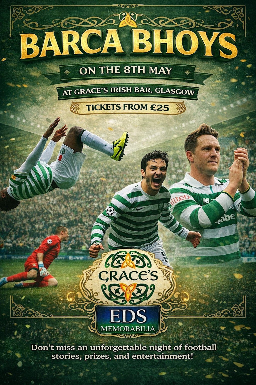An evening with Tony Watt, Kris Commons & Efe Ambrose. Hearing stories from that memorable night in 2012. Live music, raffle & Auction.