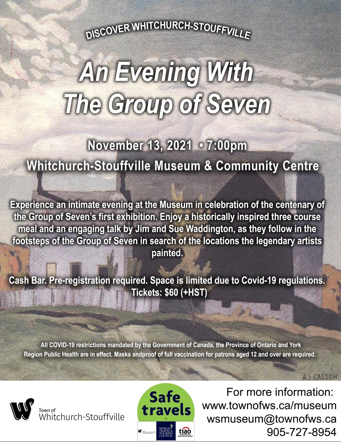 Experience an intimate evening at the Museum in celebration of the centenerary of the Group of Seven's first exhibition. Enjoy a historically inspired three course meal and an engaging talk by Jim and Sue Waddington as they follow in the footsteps of the Group of Seven in search of the locations the legendary artists painted.