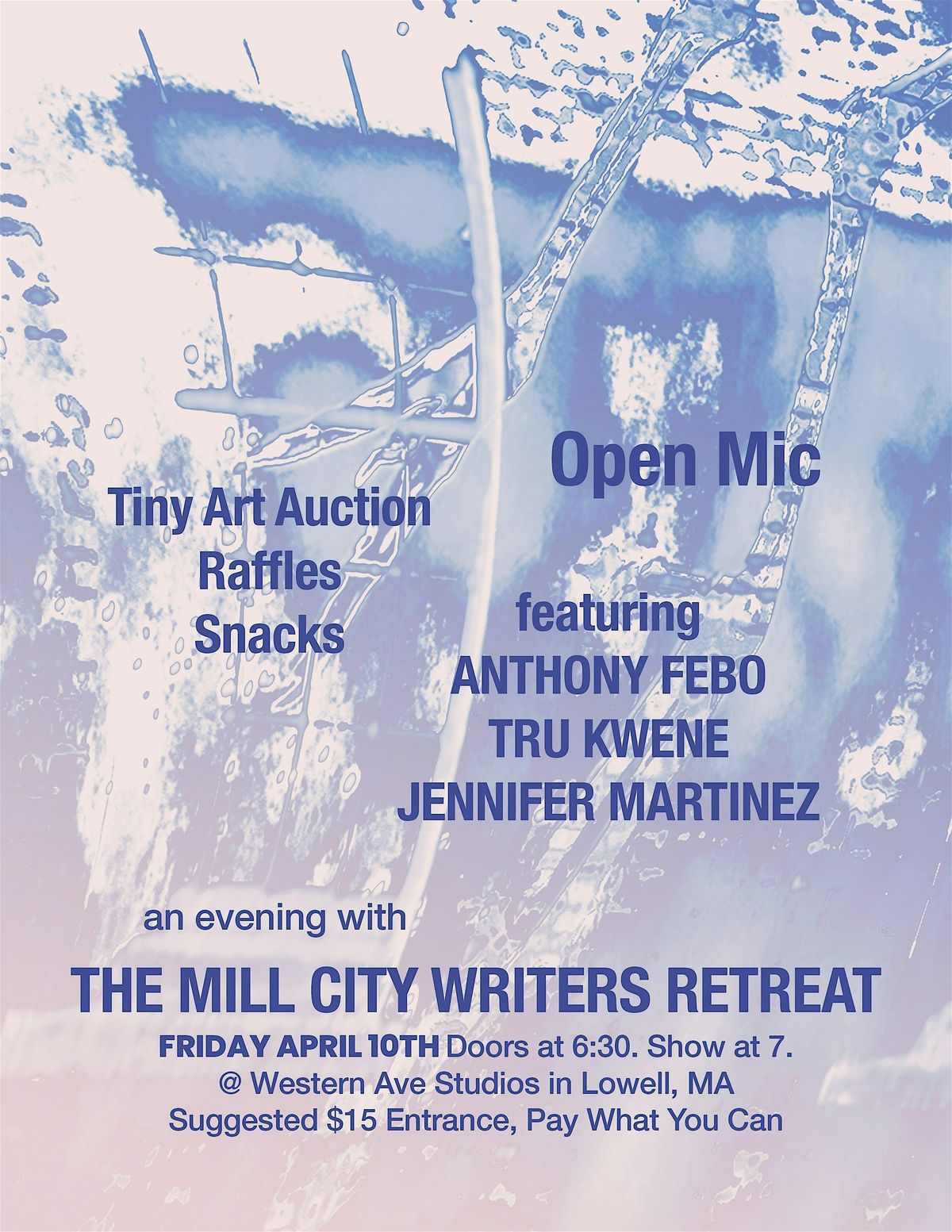 Join us for an evening of featured poets, an open mic, raffle prizes, a tiny art auction, snacks, and fun with friend! All proceeds from the event will go towards funding the retreat in an effort to make it as sustainable as possible for our community. The Mill City Writers Retreat is a semi-annual writers retreat with a mission to ulift the craft of poets in the greater Lowell area with dedicated and curated time away. We're so excited about this year, and hope we'll see you at our event on April 10th!
