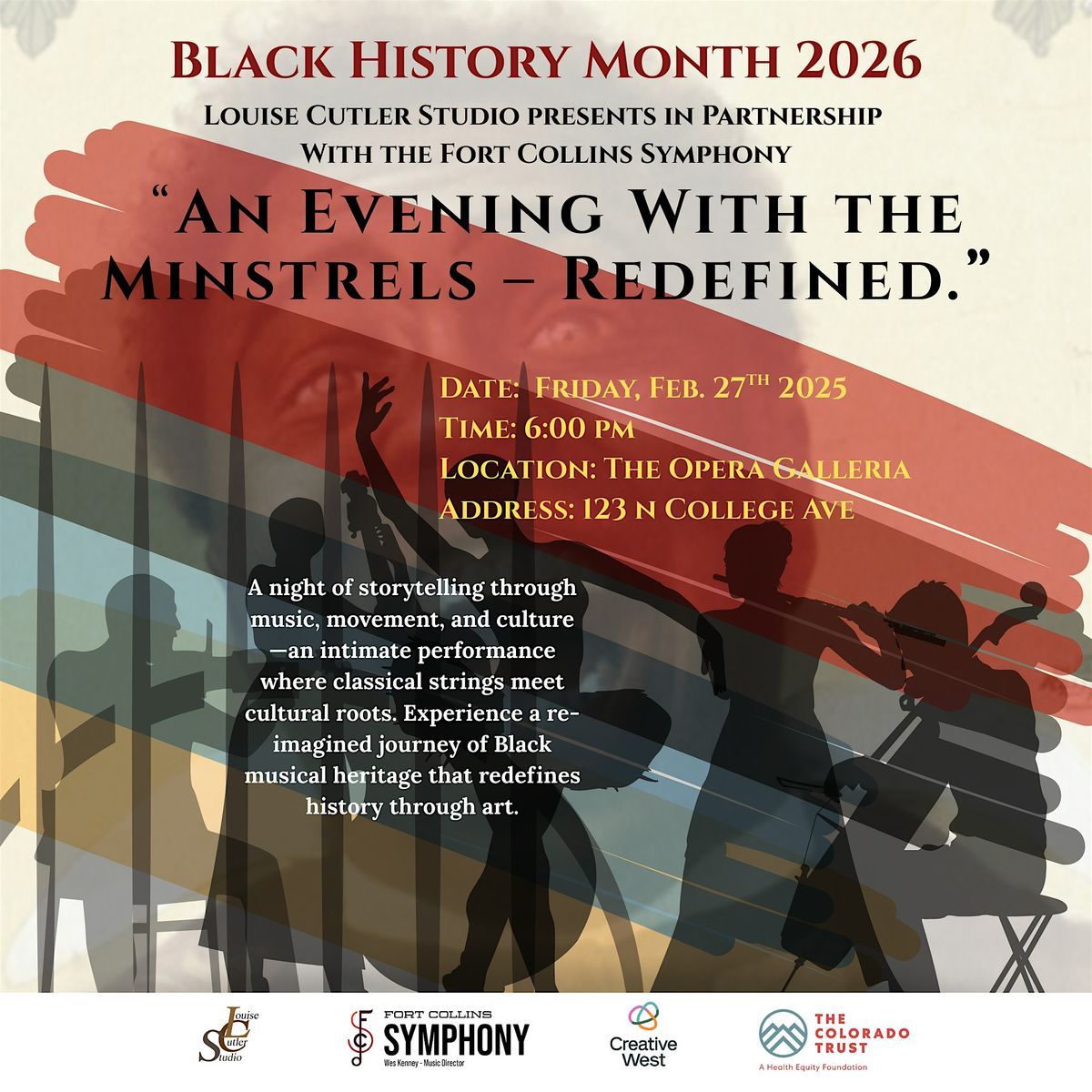 Fort Collins, CO — Louise Cutler Studio CAP is proud to present An Evening With the Minstrels – Redefined in partnership with the Fort Collins Symphony, a powerful cultural event that brings together classical music, dance, poetry, and visual storytelling to honor and uplift the legacy of Black composers and performers.