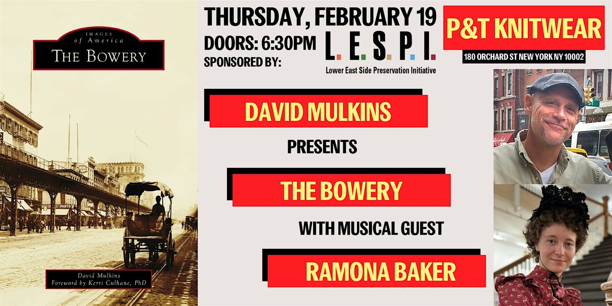 P&T Knitwear is pleased to welcome David Mulkins to give his illustrated talk on the history of . Stretching 1.25 miles from Chatham Square to Cooper Square, the Bowery was an Indigenous trail, Dutch farm road, free Black homesteads, and Washington's march route during the British evacuation, and became the main street of immigrants & the working class. NYC's first entertainment district, it has seminal links to tap dance, vaudeville, Yiddish theater, Stephen Foster, Irving Berlin, Herry Houdini, and modern tattooing. It later became an iconic skid row, but reemerged and helped foster Abstract Expressionism, Beat literature, Free Jazz, and punk rock.