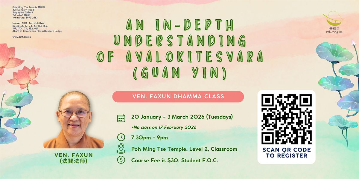 This 6-session course, taught by Ven. Faxun, will offer participants a clear and insightful exploration of Guan Yin’s role in Mahayana Buddhism. Focusing on the Universal Gate Chapter (普门品) of the Lotus Sutra, we will dive into key teachings and practical applications of Guan Yin’s compassionate qualities in our daily lives.