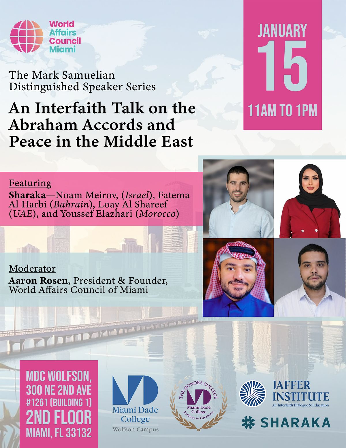 You are invited to join the World Affairs Council of Miami on Thursday, January 15, from 11:00 AM to 1:00 PM for a timely and thought-provoking program, An Interfaith Talk on the Abraham Accords and Peace in the Middle East, featuring a distinguished panel from the NGO Sharaka—representing Israel, Bahrain, the United Arab Emirates, and Morocco.