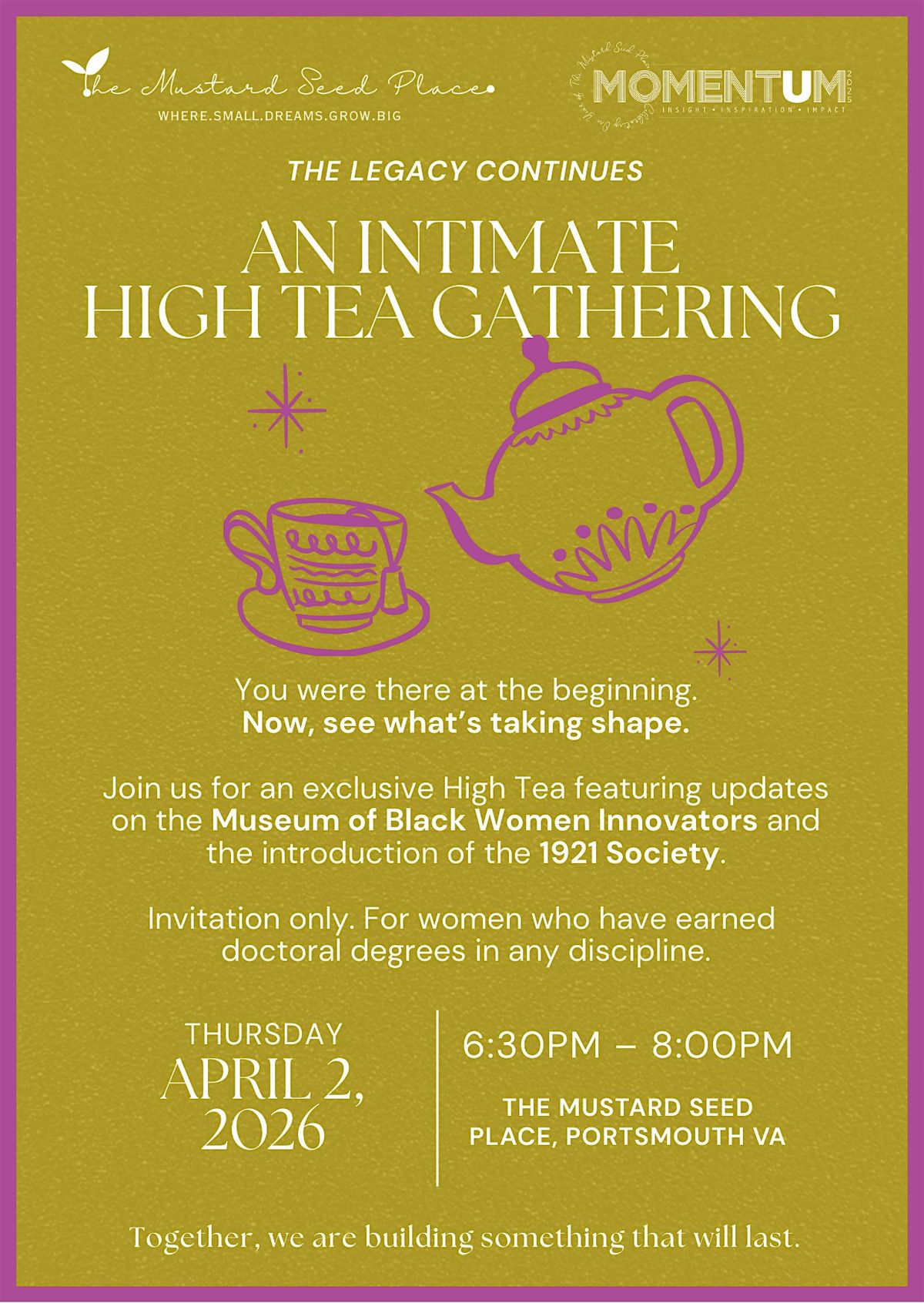 Join us for an exclusive High Tea with a Twist event featuring updates on the Museum of Black Women Innovators and the introduction of the 1921 Society. This invitation-only gathering is for women who have earned doctoral degrees in any discipline. Together, we are building something that will last.