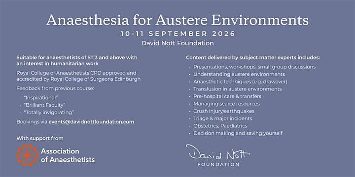 Join us on the 10th and 11th of September at the Association of Anaesthetists’ Headquarters, by David Nott Foundation, for an immersive two-day course focused on delivering anaesthesia in austere and humanitarian environments.