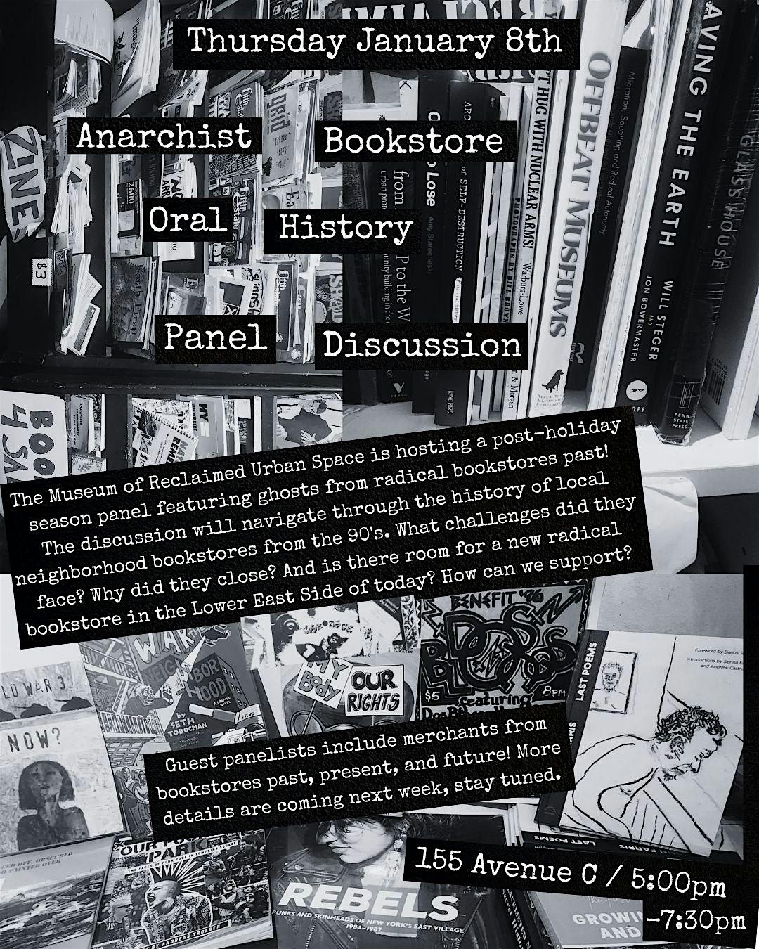 On Thursday January 8th, The Museum of Reclaimed Urban Space is hosting a post-holiday season panel featuring ghosts from radical bookstores past! The discussion will navigate through a history of local neighborhood bookstores from the 90's. What challenges did they face? Why did they close? And is there room for a new radical bookstore in the Lower East Side of today or tomorrow? How can we help?