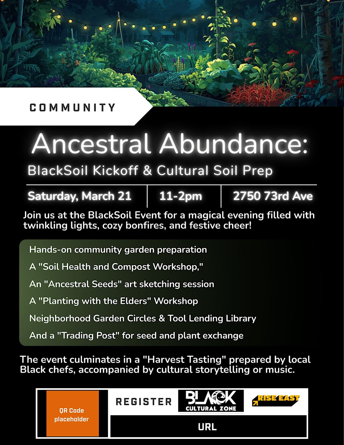 Join us for Ancestral Abundance: BlackSoil Kickoff & Cultural Soil Prep, a community gathering rooted in culture, connection, and collective care for the land. This event brings neighbors together to prepare the soil for the upcoming growing season while honoring ancestral traditions of land stewardship, food sovereignty, and community healing.