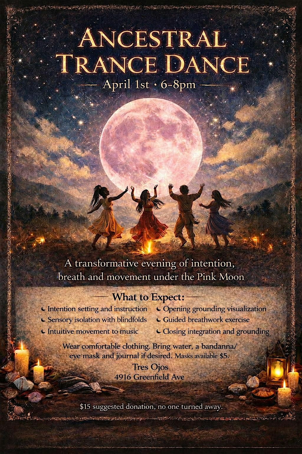 Join us for a powerful night under the Pink Moon where we will remind our bodies of the innate ability we all have to seek guidance, empowerment, manifest and deepen the connection with ourselves and greater consciousness. No experience need, all physical abilities are welcome!