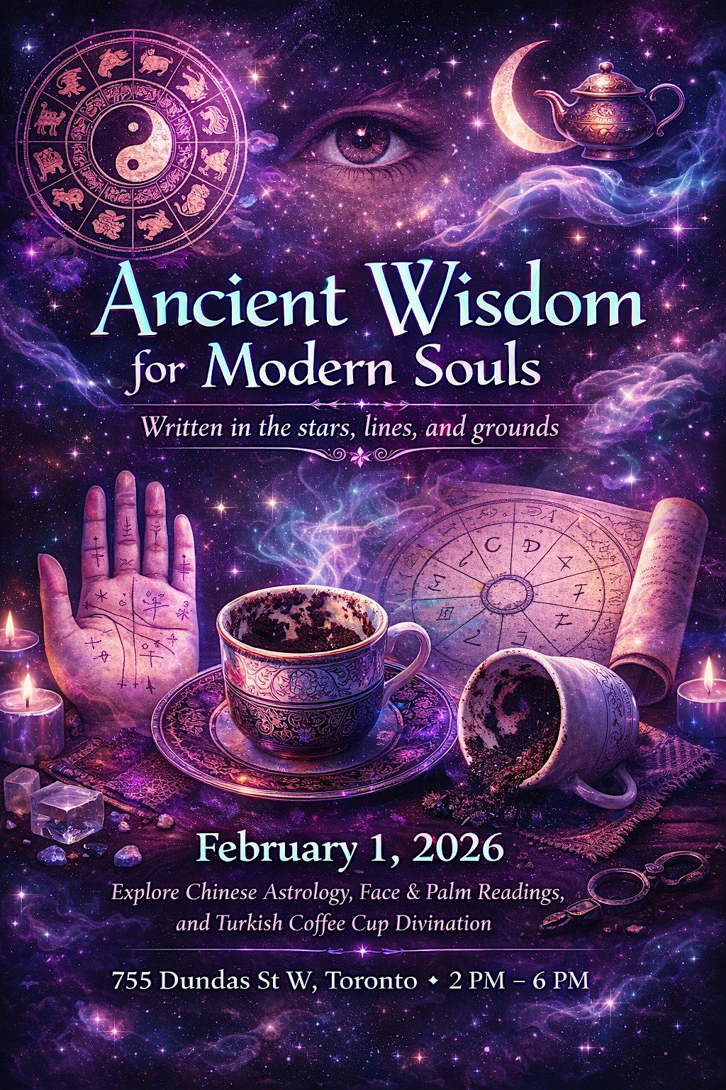 Ancient Wisdom for Modern Souls invites you to experience a rare fusion of ancient Eastern and Mediterranean divination arts on February 1, 2026. Discover what the past and present reveal about your path through ancient Chinese face and palm readings, Eastern Chinese astrology and Ba Zi readings, and Turkish coffee cup readings. Enjoy mini readings, with optional add-ons available upon request, and sample authentic Turkish coffee from our exclusive house blend, Beryl’s Reading Blends (decaf available). Shop a curated selection of Turkish coffee cups, coffee packs, authentic tablecloths and tray cloths, and good-luck bracelets available for purchase. This is a free event, open to all—drop in anytime between 2:00 pm and 6:00 pm. Attendees will receive surprise gifts and exclusive discounts on upcoming bookings. Hosted by Beril Cakiroglu and Rockie Cheng, this is a one-of-a-kind experience blending culture, intuition, and tradition. Spots are limited—register on Eventbrite and don’t miss it.