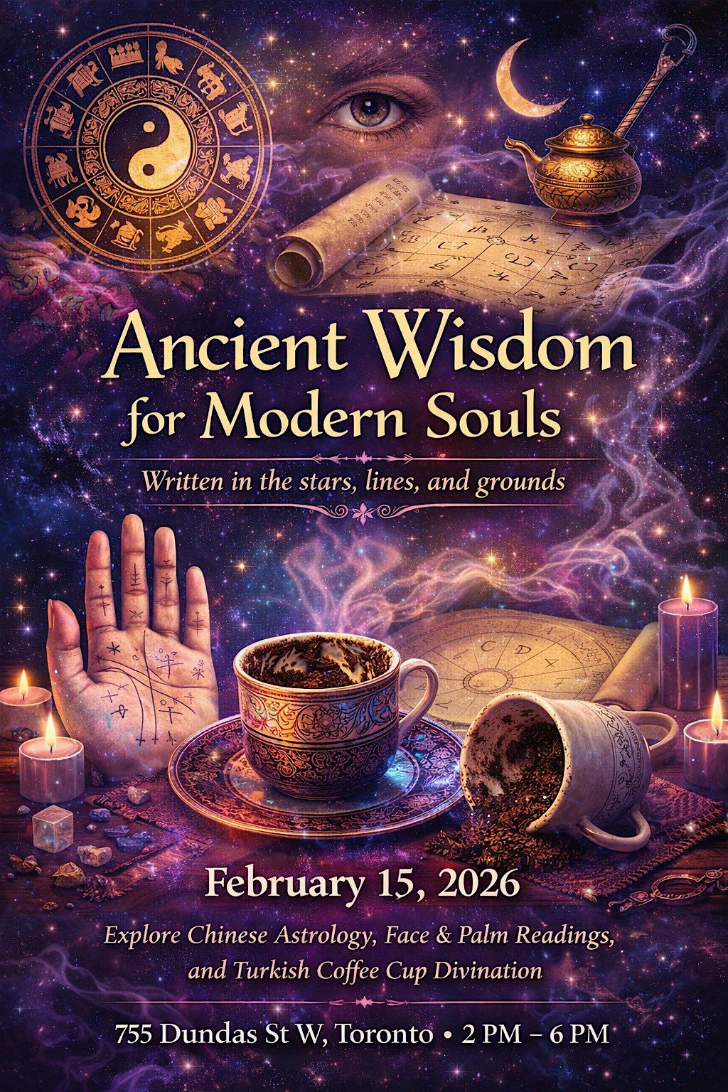 Step into a luminous meeting of cultures and intuition at Ancient Wisdom for Modern Souls on February 15, 2026, returning once again to 755 Dundas St W, Toronto, from 2:00 pm to 6:00 pm. This immersive experience weaves together ancient Eastern and Mediterranean wisdom, offering insights through ancient Chinese face and palm readings, Eastern Chinese astrology and Ba Zi readings, and Turkish coffee cup readings. Guests are invited to enjoy mini readings, with optional add-ons available upon request, while sampling authentic Turkish coffee from our exclusive house blend, Beryl’s Reading Blends (decaf available). Browse a curated selection of Turkish coffee cups, coffee packs, authentic tablecloths and tray cloths, and good-luck bracelets available for purchase. Expect surprise gifts and special discounts on future bookings throughout the afternoon. Join us for this one-of-a-kind gathering where ancient traditions illuminate modern lives.