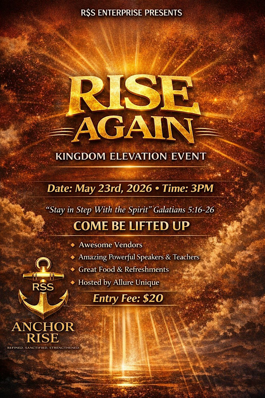 Get ready to feel Renewed, Inspired, and full of Strength at this amazing in-person event. It's all about lifting each other up, sharing positive vibes, and igniting that fire within you to reach new heights. Don't miss out on a day packed with energy, motivation, and a community that vibes with your journey. Let's RISE together!