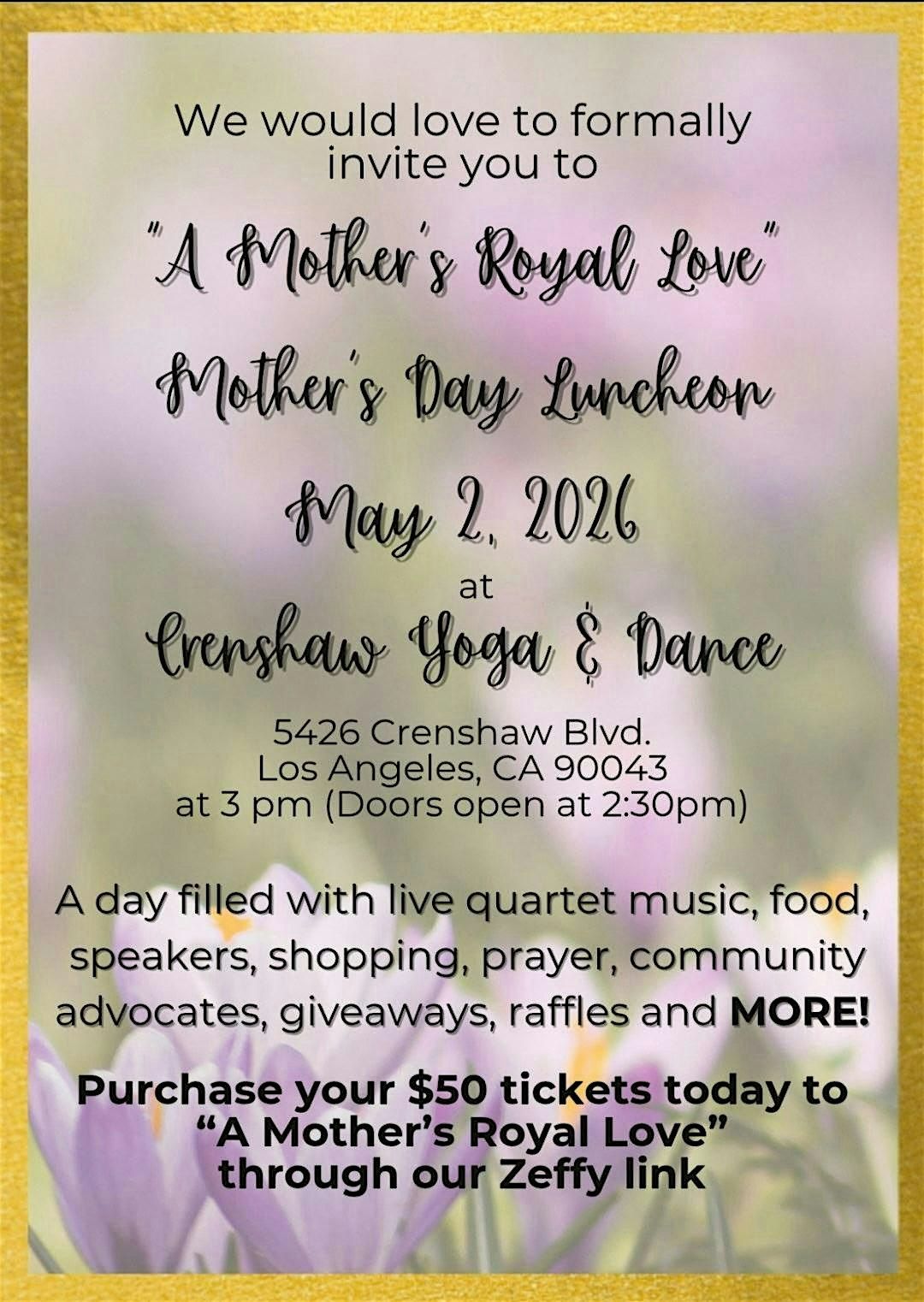 Join us as we celebrate and honor the community mothers of Los Angeles and the surrounding cities. There will be live music, fine dining, local advocates, shopping, giveaways, raffles, prayer and much more! Every ticket registration will bring us closer to achieving our mission. Together, we can create a brighter compassionate world for us all.