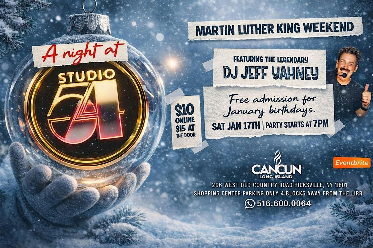 Cancun Nightclub, Hicksville. Long Island proudly presents "A Night At Studio 54" Saturday January 17th The 5th Annual MLK Weekend Party with the Legendary DJ Jeff Yahney !