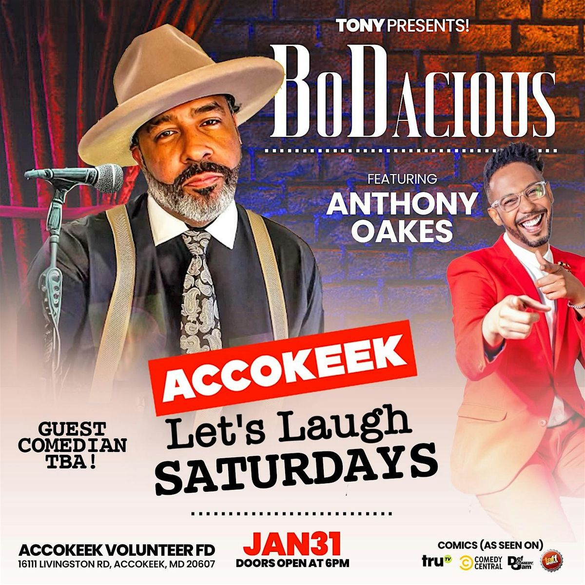 Get ready for a night full of good vibes starring hilariously funny Bodacious and Anthony Oakes! Join us in person for "ACCOKEEK LET'S LAUGH SATURDAY'S" – the perfect way to kick back and enjoy some hilarious moments with friends. No screens, just pure live fun and comedy to brighten up your weekend. Don’t miss out on the laughs and great company!